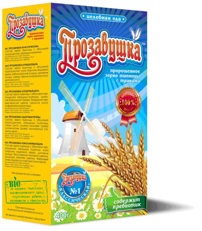 «ПРОЗАВУШКА» - продукт из проросшего зерна пшеницы с добавлением зародышей пшеницы, муки кедровых орешков, плодов и трав. Содержит пребиотик, стимулирующий рост и жизнедеятельность собственной микрофлоры кишечника. Используется как натуральная и энергетическая пища, вкусная еда быстрого приготовления с лечебно-оздоровительными эффектами. Не является БАДом.