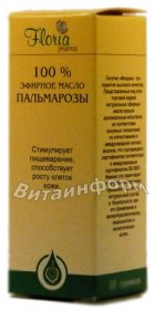 Действие: В виде 8% раствора оно за 48 часов не оказывает на кожу человека раздражающего и сенсибилизирующего действия, Фототоксический эффект отсутствует. Эфирное масло широко применяют в парфюмерии, косметике и медицине. В ароматерапии масло пальмарозы рекомендует для снятия нервного напряжения, депрессии, меланхолии. Масло обладает антисептическим и успокаивающим действием. Стимулирует эндокринную систему и отток лимфы. Косметика: нормализует работу сальных и потовых желез, устраняет тяжелый запах нездорового секрета кожи, придает коже свежесть, молодой и здоровый вид. Регенерирует клетки кожи лежачих больных и стариков. Является идеальным средством для интимной косметики. Дозировка: в аромалампах — до 6 капель; в ванны — 5-6 капель; в массажном масле — до 7 капель на 10 г растительного масла. Хорошо сочетается с розой, геранью, ладаном, жасмином, миррой, лимоном, розовым деревом и всеми цитрусовыми маслами.