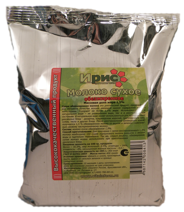 Сухое обезжиренное молоко "Avena Delicias", выпускаемое теперь под торовым наименованием "Ирис" это диетический продукт, сохранивший все полезные качества молока, имеющий низкое содержание жира и холестерина.
